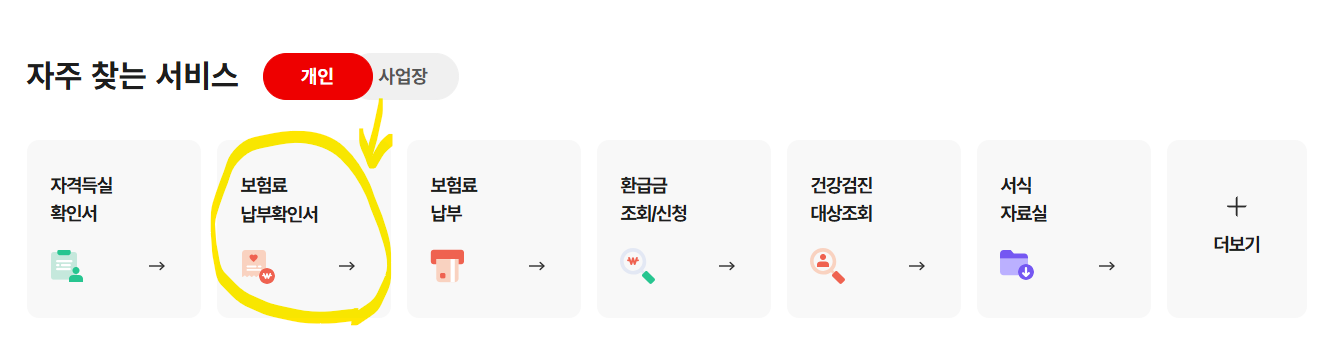 - 홈페이지 메인 메뉴에서 <자주 찾는 서비스> → <보험료 납부확인서> 클릭