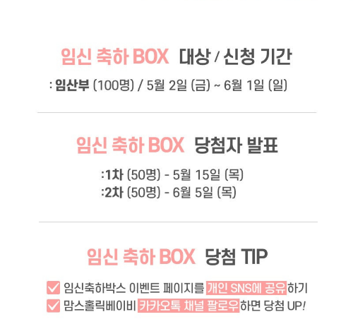 - 2차: 6월 5일 (임신축하박스 50명 + 물티슈 1박스 5명)