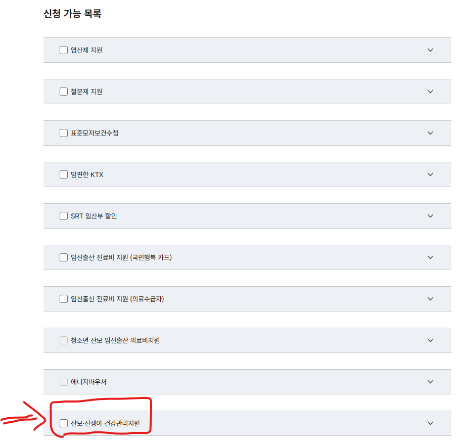 - 서비스 신청: 신청 가능 목록 중 맨 마지막에 있는 '산모·신생아 건강관리지원' 체크박스 클릭
