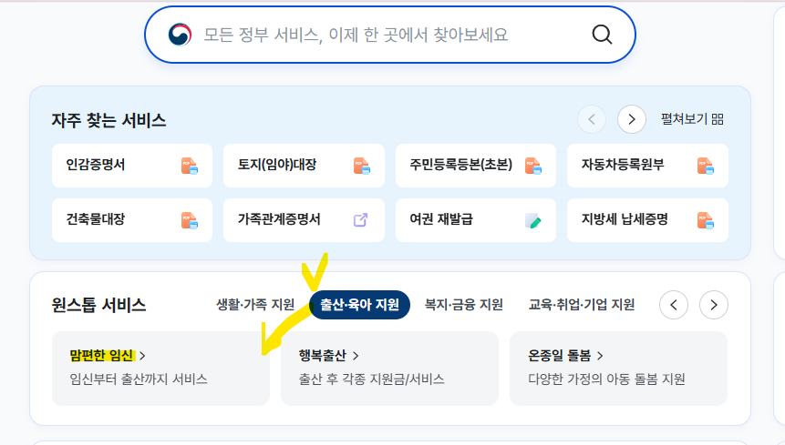 ③ 원스톱 서비스 > 출산·육아 지원 메뉴 > '맘편한 임신' 선택