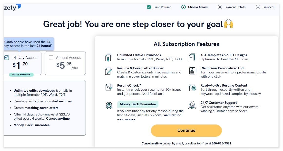 7. 모든 것이 완료되면, 작성한 이력서를 한 눈에 확인할 수 있습니다. 여기서 우측 하단에 [Download] 버튼이 있는데, 이 버튼을 클릭하시면 지불하라는 메시지가 뜹니다. 14일 동안 접근 가능한 구독권은 $1.7로, 다운로드를 바로 하고 싶으신 분들은 이 구독권을 결제하셔도 됩니다.