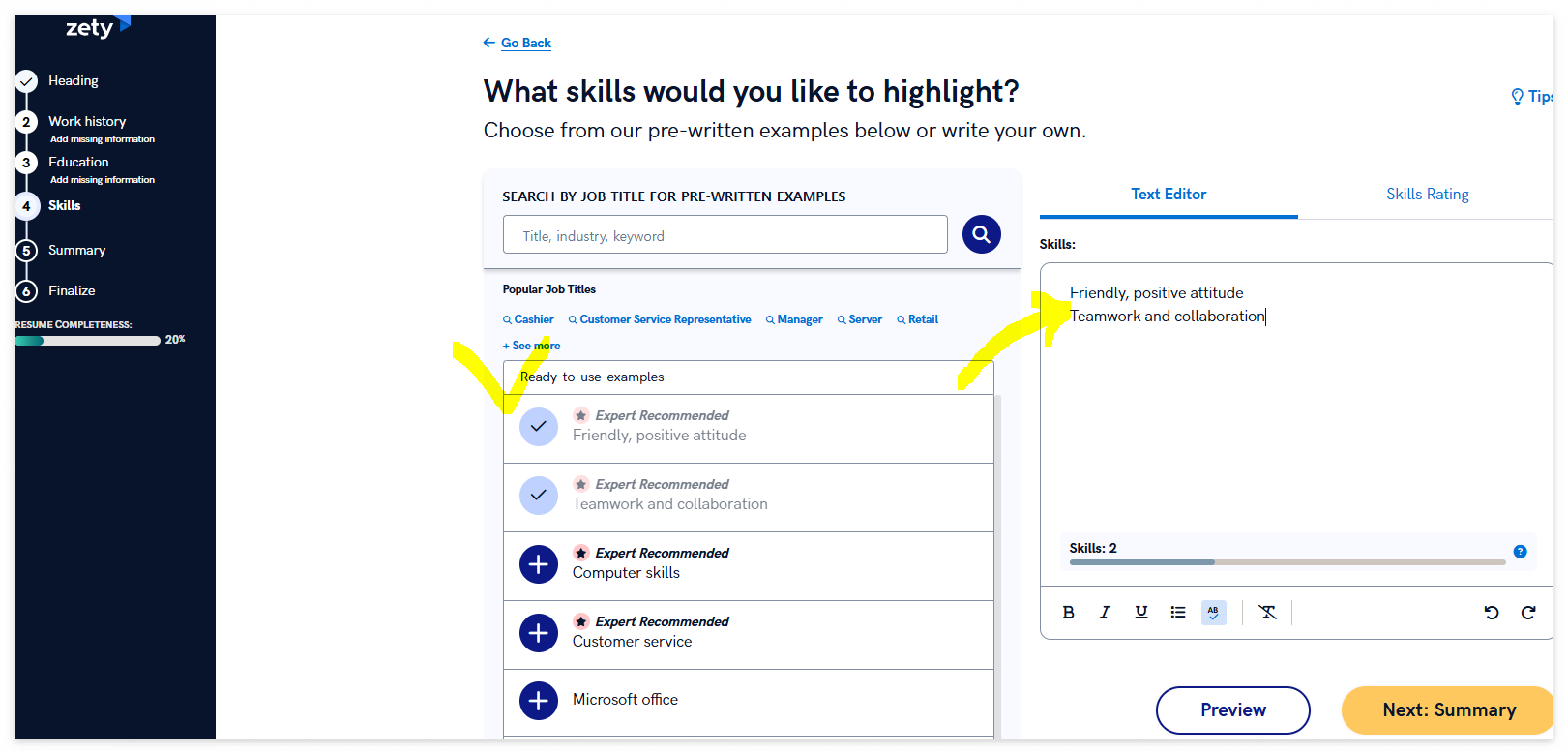 skills와 summary 작성 시, 왼쪽 하단에 작성 예시가 있습니다. + 버튼을 누르면 오른쪽 작성란에 자동으로 옮겨집니다. 원하는 예시들을 선택해 보세요. 쉽게 skills와 summary 내용을 작성할 수 있습니다.