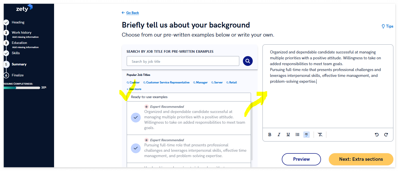 skills와 summary 작성 시, 왼쪽 하단에 작성 예시가 있습니다. + 버튼을 누르면 오른쪽 작성란에 자동으로 옮겨집니다. 원하는 예시들을 선택해 보세요. 쉽게 skills와 summary 내용을 작성할 수 있습니다.