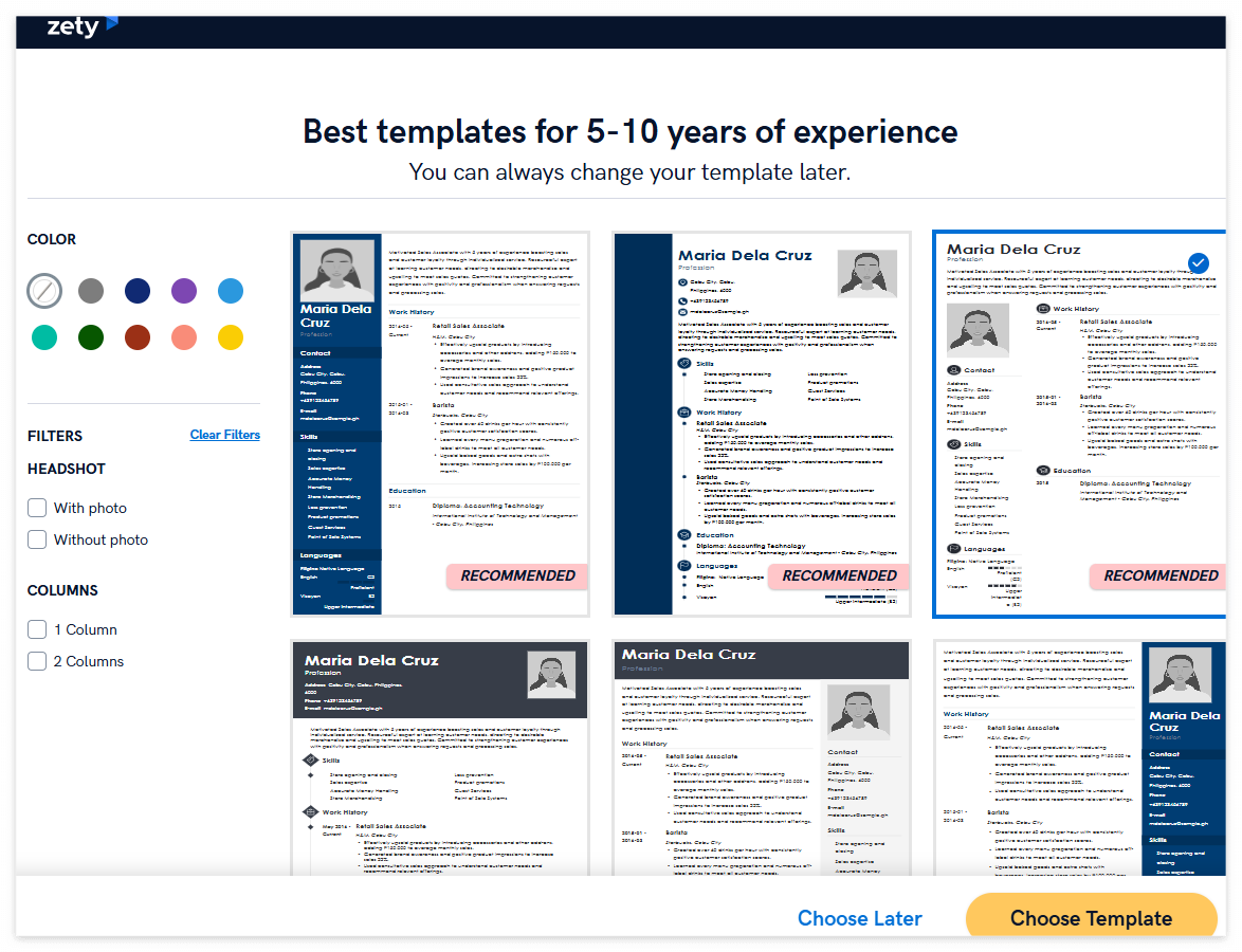 4. 원하는 디자인의 이력서 양식을 선택 후, 우측 하단에 있는 [Choose Template] 버튼을 클릭해주세요.