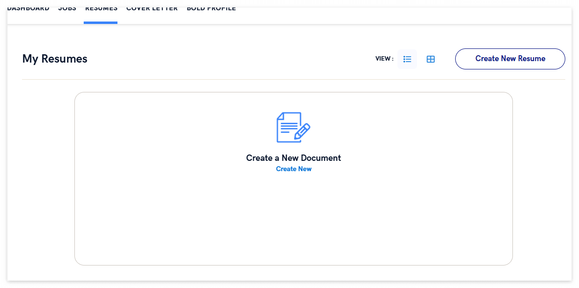 2. 가입 후, [Resumes] 메뉴에 들어가 [Create New Resume] 버튼 또는 [Create New] 텍스트 버튼을 눌러 이력서 작성을 시작합니다.