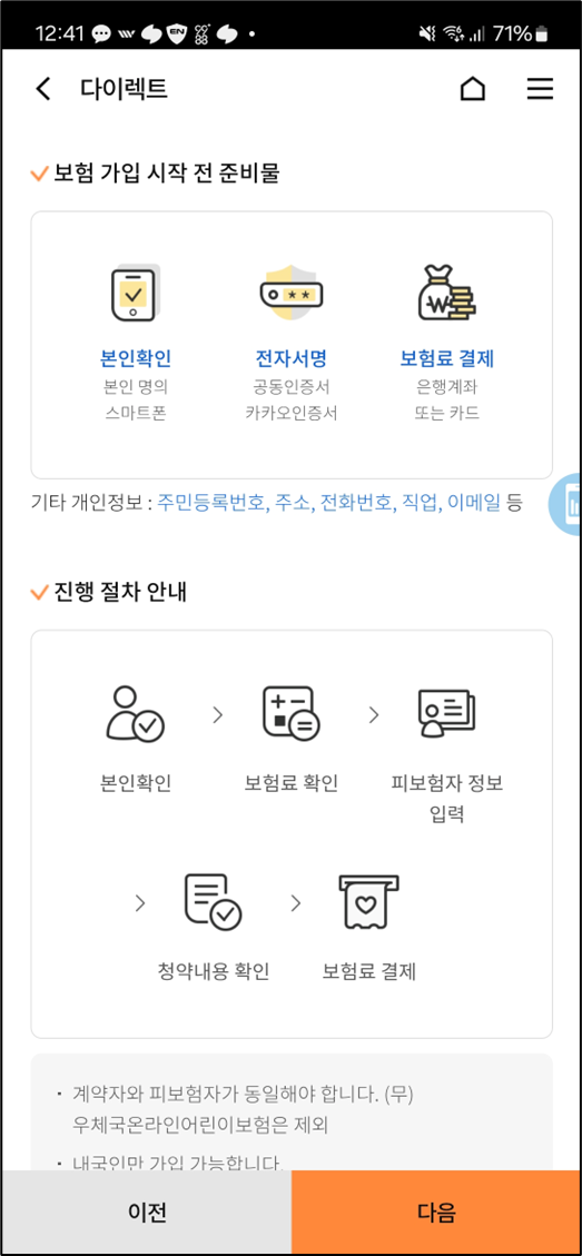 3. 진행 절차에 따라 본인 확인 및 피보험자 정보를 입력하여 신청을 진행합니다.
