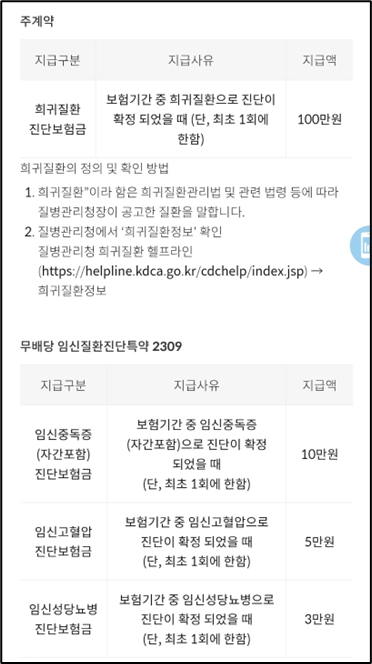 - 보험기간 중 자녀가 희귀질환으로 진단이 되었을 때, 최초 1회 100만원 지급